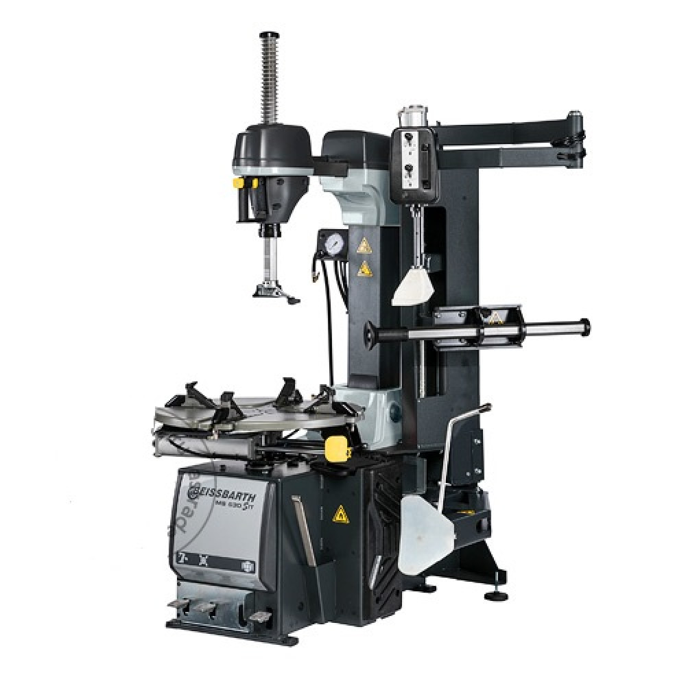 Пневматически управляемое крепление колонны усилено для повышения прочности и устойчивости наиболее нагруженных компонентов. Штанга, к которой крепится монтажная головка, теперь имеет шестиугольную форму, что придает ей дополнительную жесткость. Безопасность пользователя и защита обода также усовершенствованы. Специальный ярко-желтый дефлектор крепится к цилиндру поворотного стола служит дополнительной защитой для пользователя.