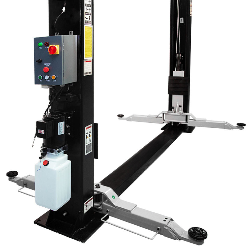 Пульт управления с печатной платой, которая сама управляет подъемником - достаточно лишь нажать кнопку спуска: подъемник сам приподнимет автомобиль со стопоров, отключит их, опустит автомобиль на землю, включит стопора после завершения спуска и при этом сохранит сами кнопки управления безопасными (24 В), в отличие от более бюджетных подъемников, где «на кнопке» - все 380 В питающего напряжения;