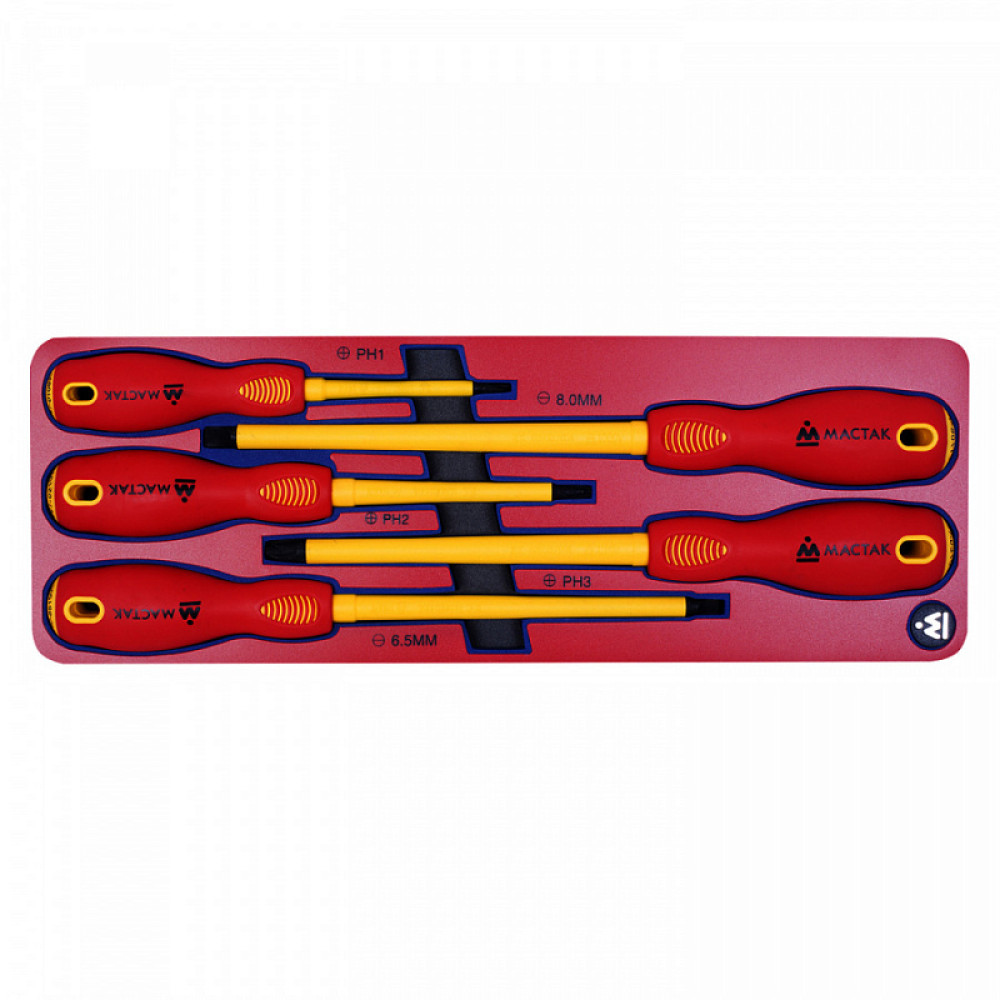 Набор инструментов 5 предметов отвертки диэлектрические Мастак 5-4005Е в ложементе из материала EVA предназначен для комплектации передвижных инструментальных тележек или слесарных верстаков при создании индивидуальных рабочих мест на станциях технического обслуживания автомобилей и других предприятиях, занимающихся обслуживанием и ремонтом различной техники.