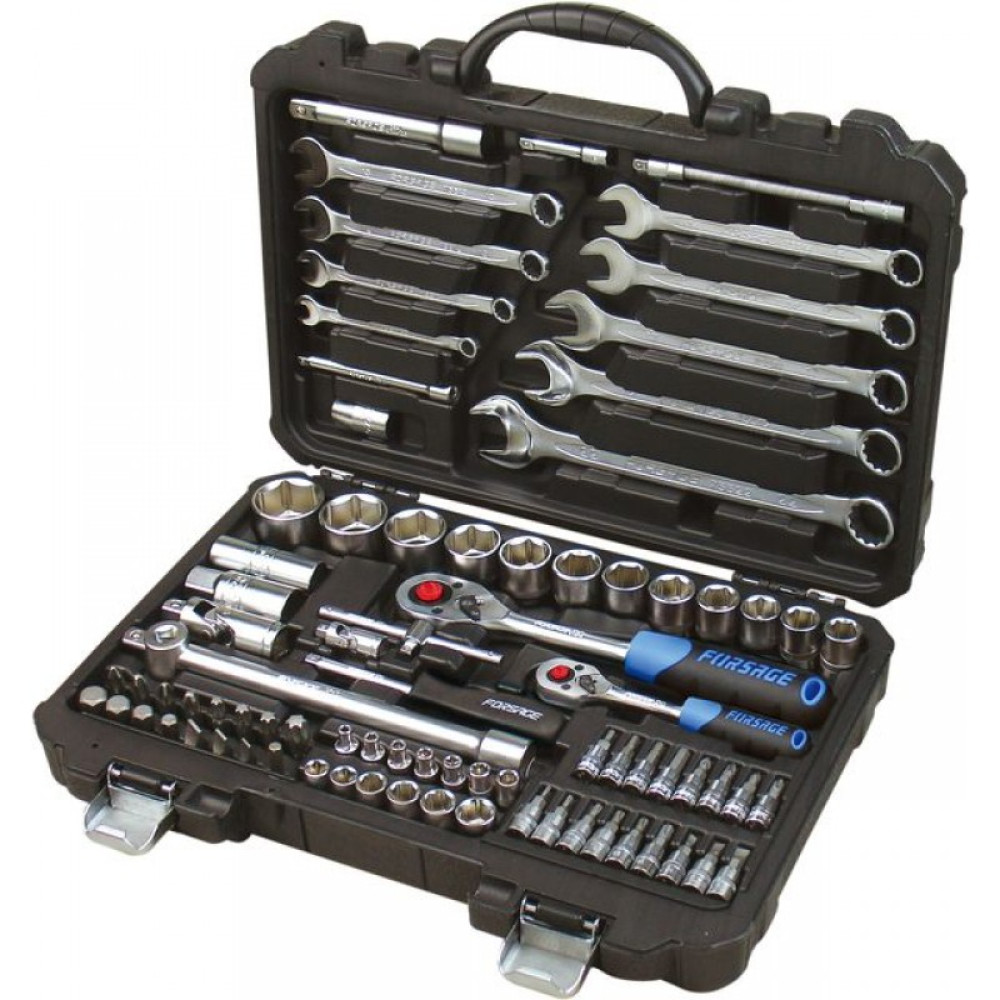 Посадочный квадрат: 1/2", 1/4". Тип головок: 6-гранные, короткие. Комплектация: головки 1/4"короткие 25 мм: 4, 4.5, 5, 5.5, 6, 7, 8, 9, 10, 11, 12, 13, 14 мм; головки-биты 1/4"HEX 35 мм: 3, 4, 5, 6 мм; головки-биты 1/4"TORX 35 мм: T8, T10, T15, T20, T25, T30; головки-биты 1/4"SL 35 мм: 4, 5.5, 7; головки-биты 1/4"РН 35 мм: РН.1, РН.2; головки-биты 1/4"PZ 35 мм: PZ.1, PZ.2; трещотка 1/4"; рукоятка 1/4"150 мм; вороток Т-образный 1/4"115 мм; удлинители 1/4": 50, 100 мм; гибкий удлинитель 1/4"145 мм; кардан шарнирный 1/4"; биты 5/16"HEX 30 мм: 8, 10, 12, 14 мм; биты 5/16"TORX 30 мм: Т40, Т45, Т50, Т55; биты 5/16"SL 30 мм: 8, 10, 12; биты 5/16"PH 30 мм: PH.3, PH.4; биты 5/16"PZ 30 мм: PZ.3, PZ.4; головки 1/2"короткие 38 мм: 14, 15, 16, 17, 18, 19, 20, 22, 24, 27, 30, 32 мм; головки свечные 1/2": 16, 21 мм; трещотка 1/2"; удлинители 1/2": 125, 250 мм; кардан шарнирный 1/2"; адаптер с отверстием с 3/8"(F)*1/2"(M); адаптер-переходник под шуруповерт 1/4"(F)*1/4"(F) 30 мм; битодержатель 1/2"(F)*5/16"(F); ключи комбинированные рожково-накидные: 8, 10, 12, 13, 14, 15, 16, 17, 19 мм. Пластиковый кейс с металлическими защелками.