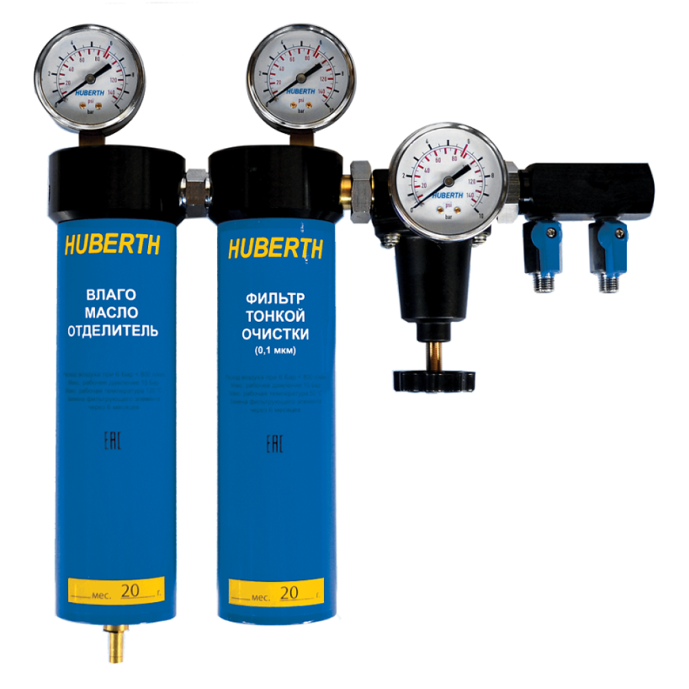 вухступенчатый воздушный фильтр Huberth RP106002 с редуктором и тремя манометрами для очистки сжатого воздуха и нейтральных газов от водного и масляного аэрозоля, а также механических загрязнений размером более (или равных) 0.1 мкм. Фильтрация последовательно осуществляется картриджем из пористой бронзы (первая ступень) и сменным фильтром тонкой очистки из микроволокна (вторая ступень).