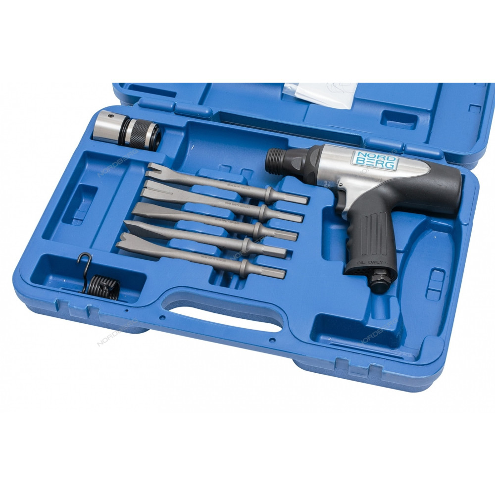 NORDBERG ПНЕВМОЗУБИЛО NP5067 в кейсе + 5 насадок + быстросъемн.адаптер (HA67-KIT) применяется для вырубания болтов, панелей кузова и пр. в кейсе 5 шестигранных зубил пружина быстросъемный адаптер эргономичная рукоятка