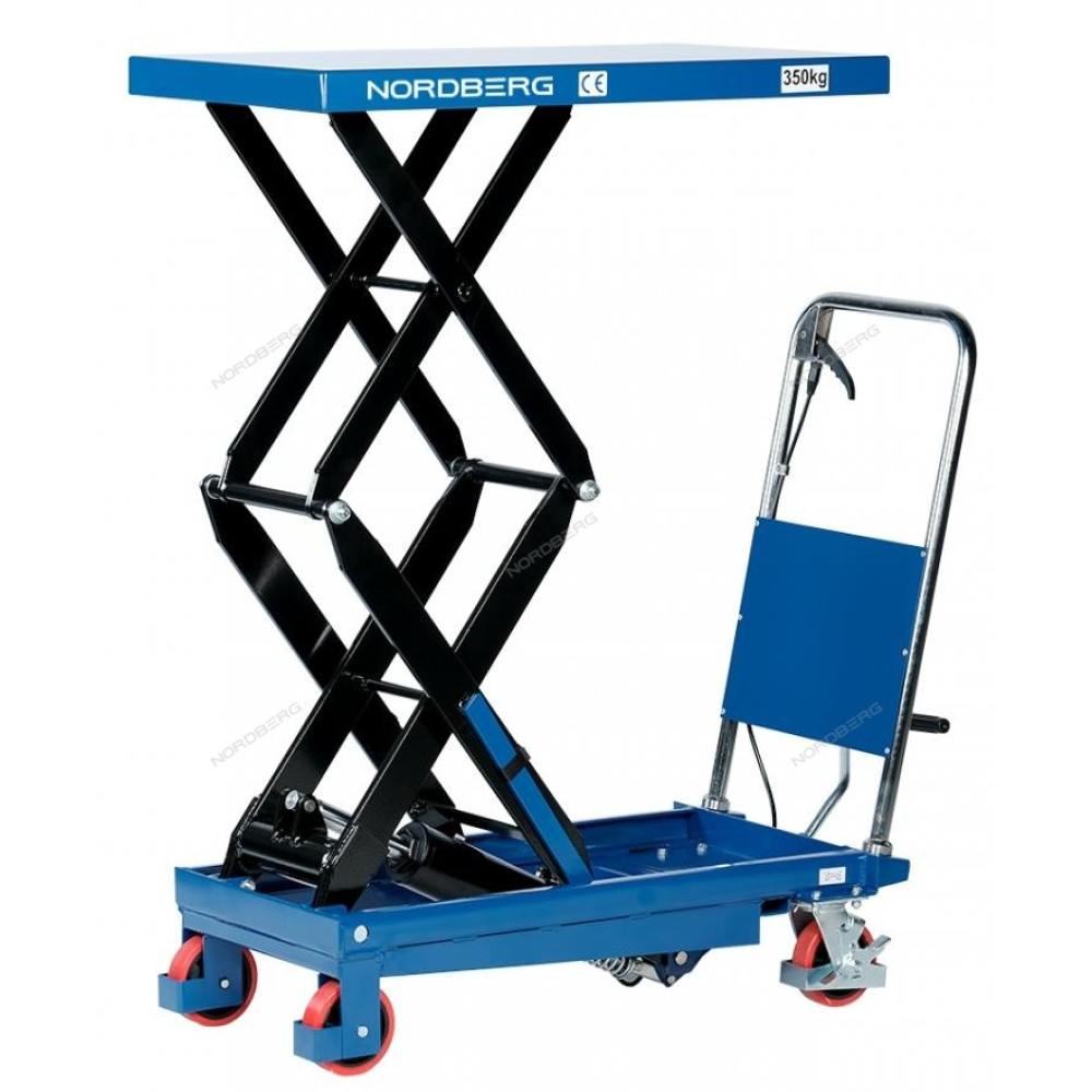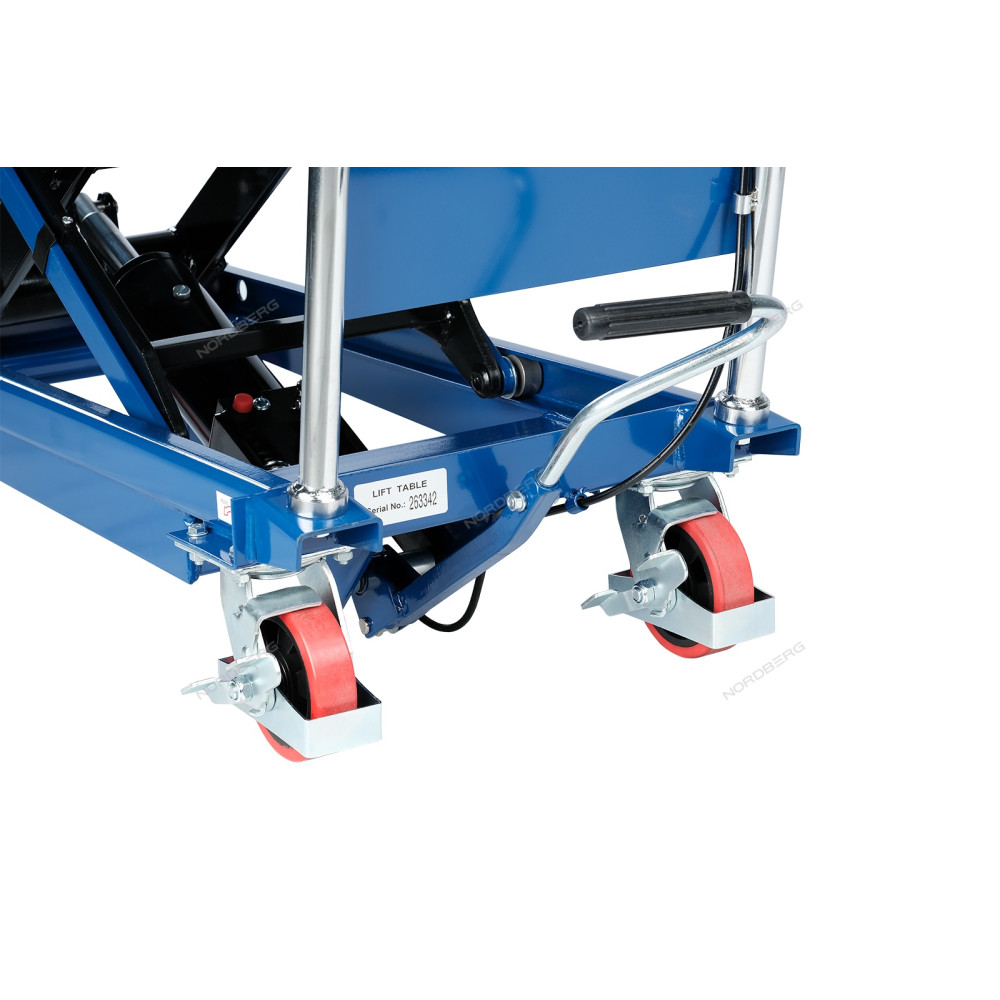 Подъемный гидравлический стол N3T680 предназначен для подъема, опускания и перемещения груза. Конструкция представляет собой совмещение платформенной тележки и стационарного подъемного стола. Подъемный стол имеет гидравлический ножной привод, который позволяет произвести быстрый подъем груза. Опускание производится путем нажатия рычага на ручке подъемного стола. Подъемный стол оснащен стопором, который позволяет надежно закрепить положение в поднятом состоянии. Гидравлическая система позволяет столу опускаться плавно, обеспечивая безопасность работ с грузами. Тележки с подъемным столом с ручным приводом мобильны, эффективны и надежны. Они позволяют не только приподнимать грузы, но и перемещать их на расстояния.
