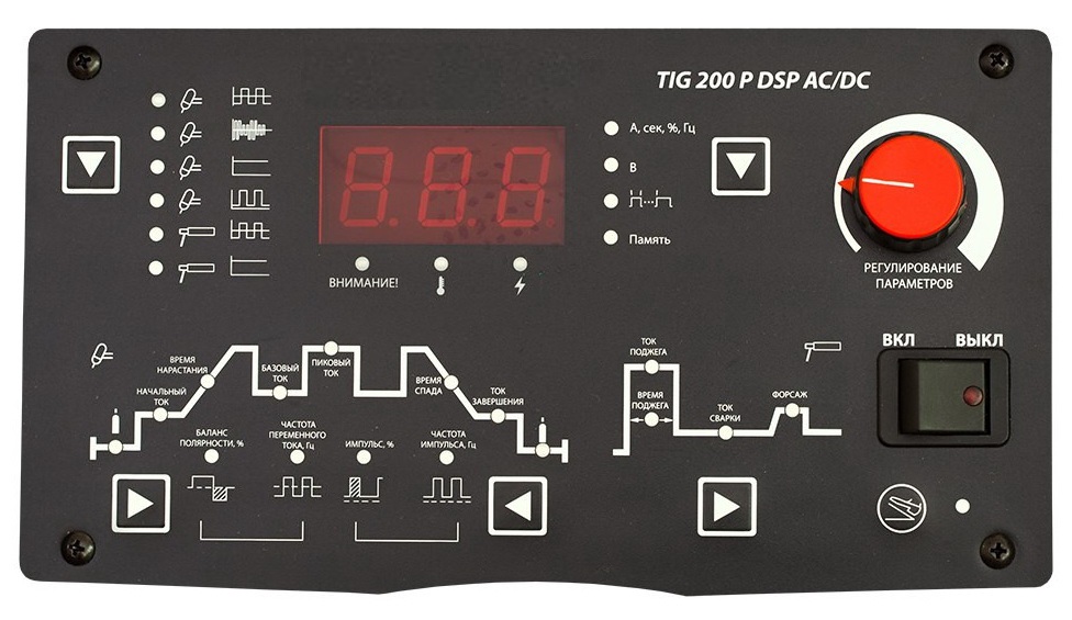 - Переключатель времени подъема/спада сварочного тока
