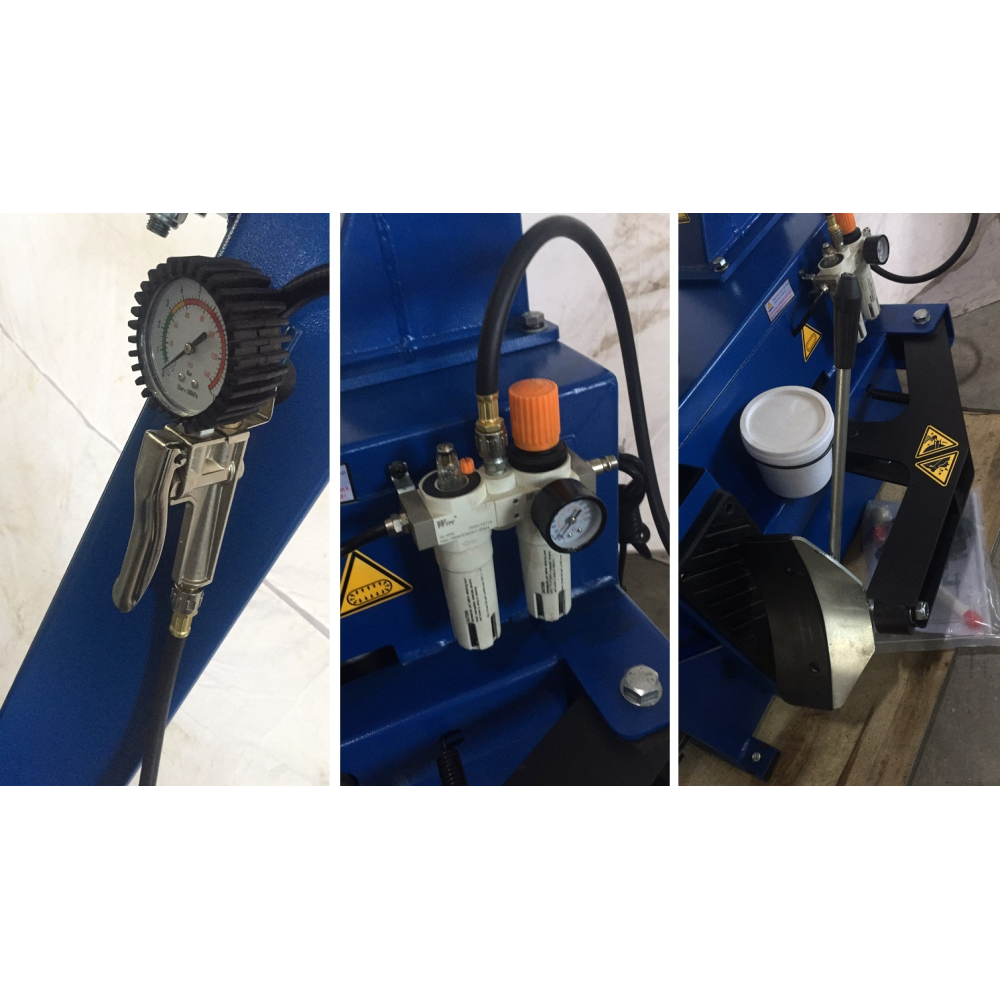 Регулятор давления с встроенным влагоотделителем исключает попадание воды в пневмосистему станка, что предотвращает коррозию и попадание влаги в колесо. Это особенно важно в условиях пониженных температур.