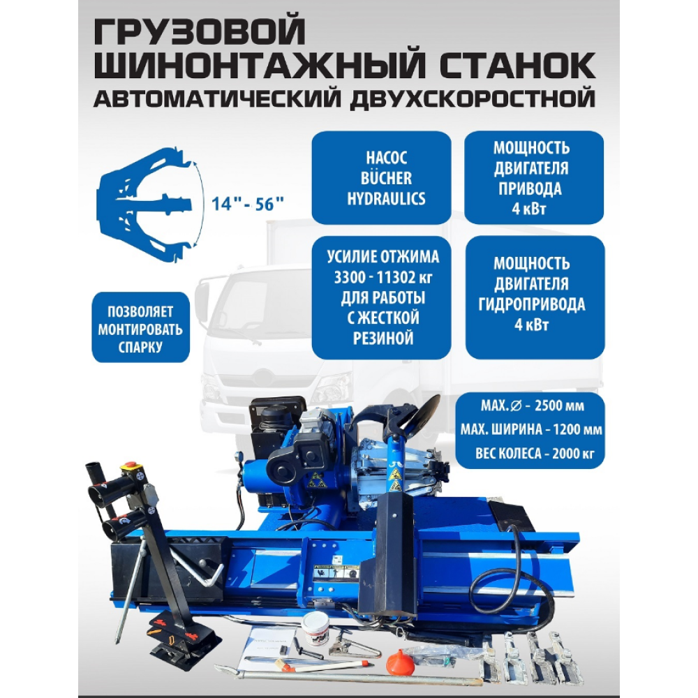 На станке установлены Моторы 4 + 4 кВт - конкурентов 2,2 + 3 кВт. В комплекте: Немецкий насос «Bucher hydraulics». Грузовой шиномонтажный станок класса «премиум» для «жестких» условий эксплуатации. Диски алюминий и сталь диаметром 14”÷56”. Максимальное колесо 2500х1200 мм, вес до 2000кг. Отжим min-max. 1 скорость - 4900-11302Н/м. 2 скорость - 3300-9300Н/м. Применяется для тракторов, сельхозтехники, дорожной, карьерной, лесозаготовительной и т.п. техники.