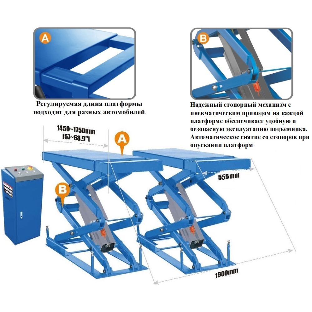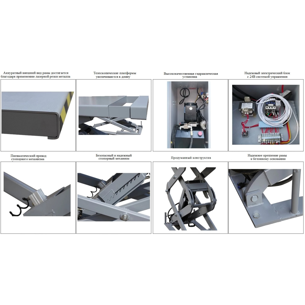 Подъемник автомобильный гидравлический ножничный заглубляемый «ровный пол», грузоподъемность 3 тонны Ножничный подъемник оборудован пневматическим стопорным механизмом – требуется подключение к пневмолинии. Раздвижные трапы подъемника позволяют увеличить длину платформ с 1550 до 1750мм. Высота подъема 2130мм, от уровня пола 1800мм., заглубление 330мм. Расстояние между платформами 780мм. Длина трапов в сложенном состоянии 1580мм. Стойка управления подъемником расположена отдельно.