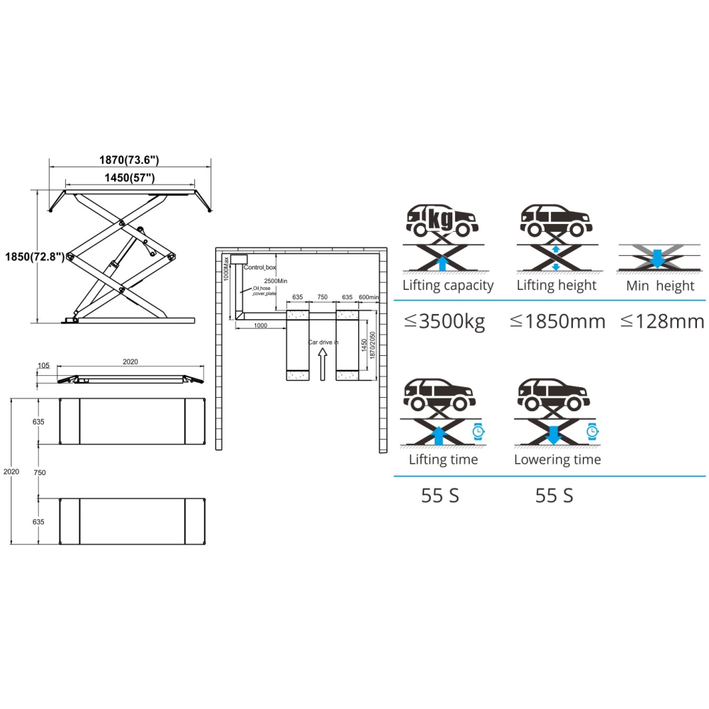 Поднимает от «Оки» до «Газели». г/п 3,0т. 220/380В. Установка на ровный пол. Высота подъёма 110-1850мм. Длина платформ 1450 мм. Подъём 4-мя гидроцилиндрами. Гарантия 24мес. Доставка РФ, РБ, Армения, Казахстан, Киргизия.